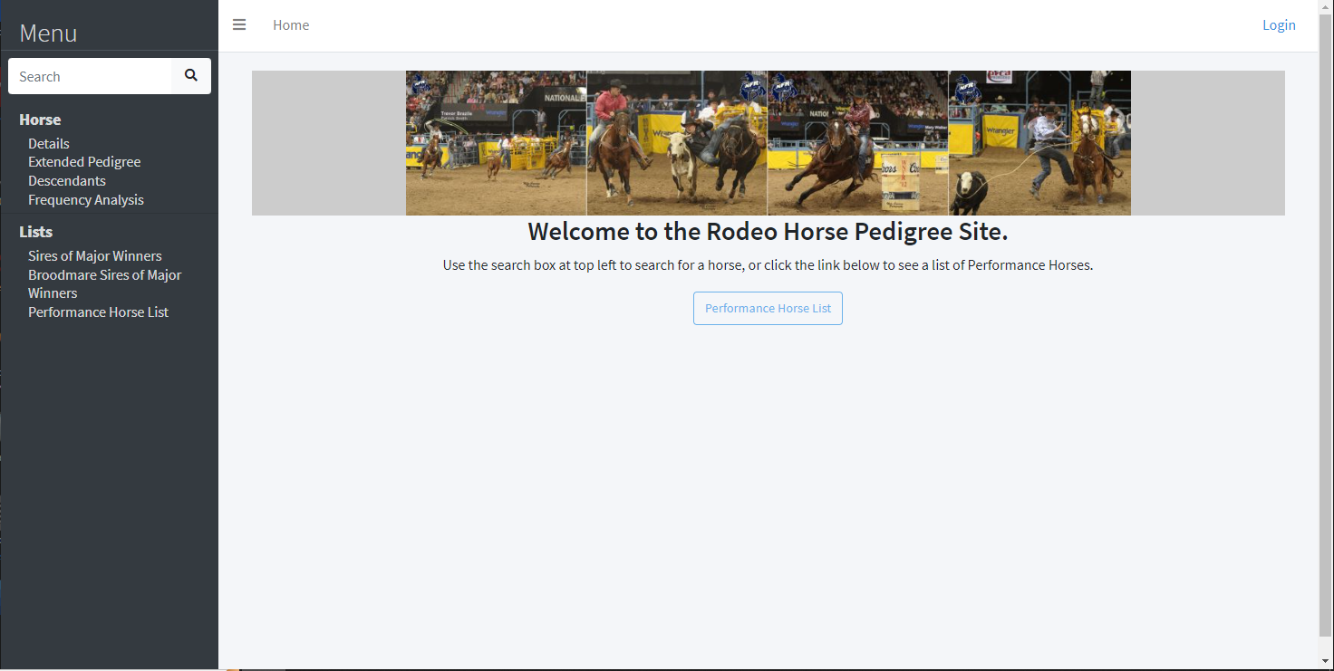 On the Rodeo Horse Pedigree Site the left sidebar menu offers the following choices.